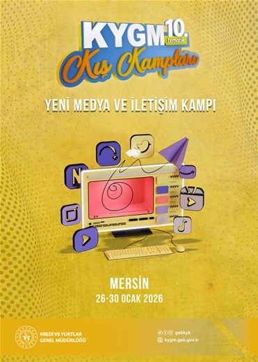 Mersin'de düzenlenecek olan Kredi ve Yurtlar Geleneksel 10'uncu Tematik Kış Kampları "Yeni Medya ve İletişim Kampı" 26-30 Ocak 2026 tarihleri arasında Mersin Kız Öğrenci Yurdunda gerçekleştirilecek.